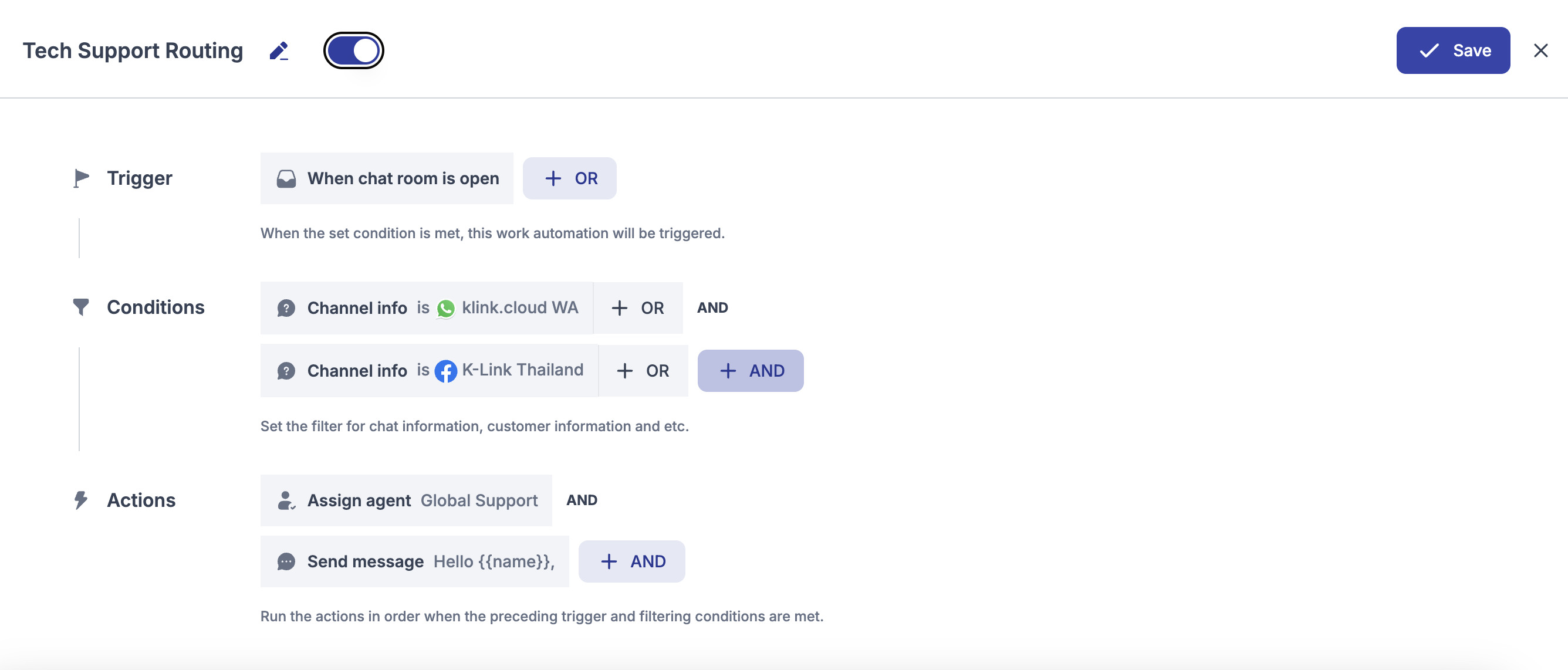 | Tech Support Routing  | When Chat Room is Opened | Channel is Telegram        | Assign to Tech Support Queue     |