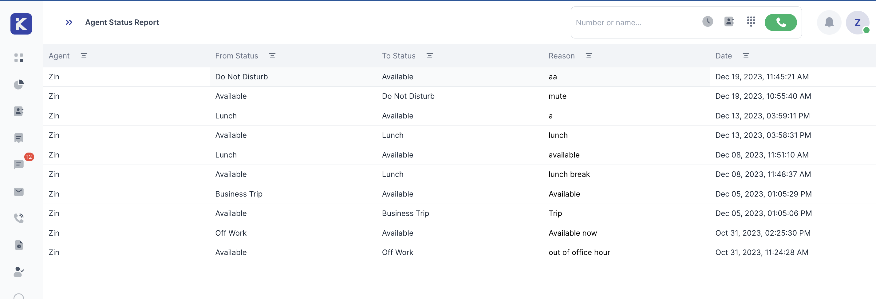 Agent status Report provides all agent activities such as Lunch Break, DND, Available & all login / logout history