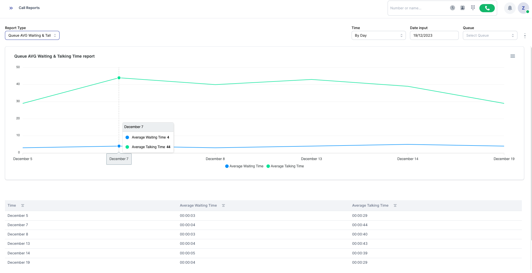 'Queue AVG Waiting & Talking Time' report provides information about the average amount of time that callers are waiting in a queue, and the average amount of time that an agent spends in handling calls. The report helps you to identify the peak times of queue calls, and allocate your agent accordingly. This topic describes the report details, and shows you a report example.