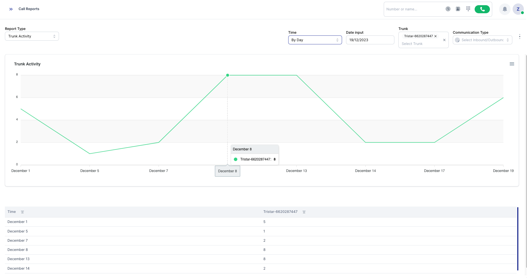 'Trunk Activity' report is a summary report displayed in line graph, which makes it possible for you to query how many inbound and outbound calls have been received or made via a specific trunk. The report allows you to track changes of trunk activity by hour, by date, or by month.