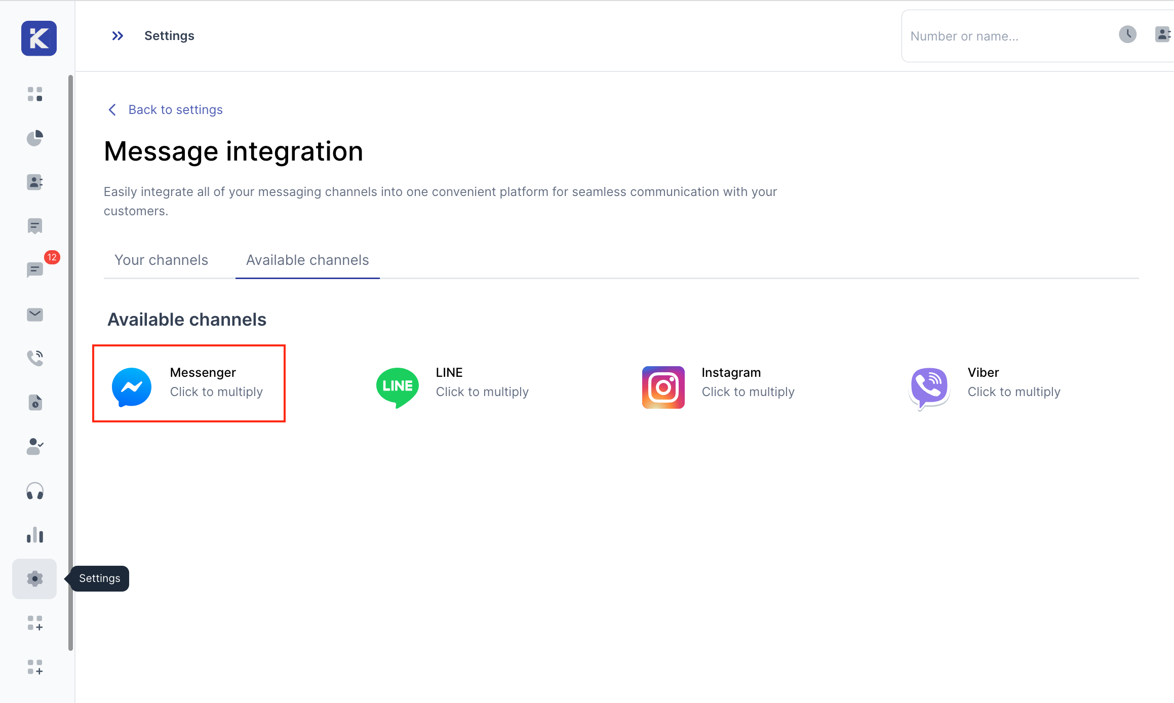 ### Step 1 - Go to Settings > Message Integration > Available Channels&#x20;