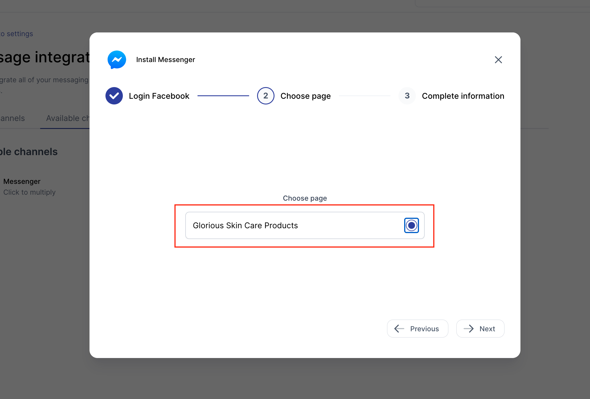 Go to Settings > Message Integration > Available Channels, and then click "Messenger"